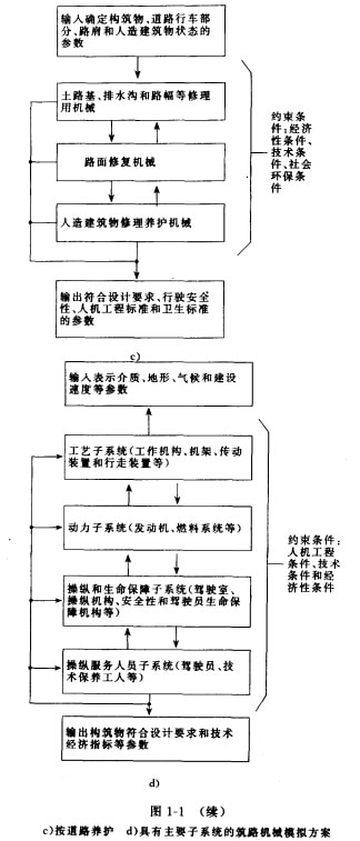 筑路機(jī)械由許多主要子系統(tǒng)組成(圖1-1d):工藝于系統(tǒng)(工作機(jī)構(gòu)和行走裝置);動(dòng)力子系統(tǒng)(發(fā)動(dòng)機(jī));操縱和生命保障于系統(tǒng)以及操作人員子系統(tǒng)。筑路機(jī)械主要特殊的標(biāo)志是具有可以周期作業(yè)和連續(xù)作業(yè)的專用工作機(jī)構(gòu)。為了布置工作機(jī)構(gòu),筑路機(jī)械應(yīng)具有原結(jié)構(gòu)的機(jī)架。為此,廣泛應(yīng)用載重汽車和拖拉機(jī)的標(biāo)準(zhǔn)底盤或輪式牽引車。路面鋪筑作用的綜合機(jī)械化和自動(dòng)化是基丁多種通用建筑機(jī)器和專用筑路機(jī)械合理的組合。