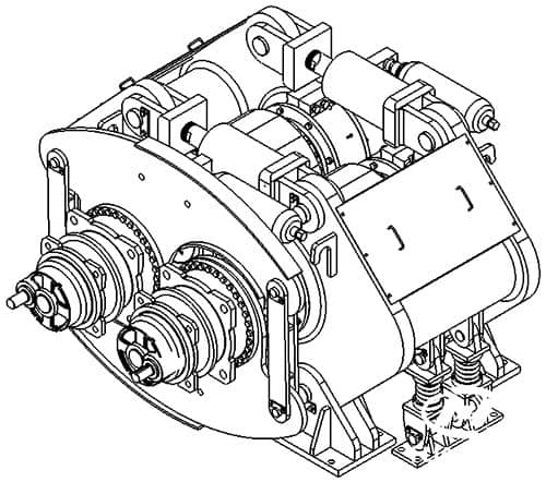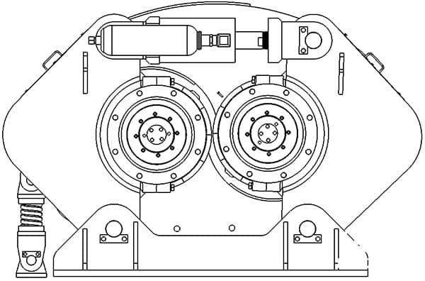 設(shè)計(jì)開發(fā)了“扭力支撐臂”結(jié)構(gòu),利用兩減速機(jī)自身扭矩方向相反而相互抵消的特點(diǎn),減少了以往輥壓機(jī)對(duì)地基高耐力的要求,同時(shí)自身結(jié)構(gòu)緊湊,節(jié)約占地空間。