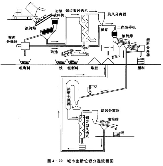 城市生活垃圾回收系統(tǒng)包括收集、運輸、破碎、篩選、重力分選、磁力分選、摩擦與彈跳分選、浮選等。下面介紹一種為堆肥工藝配備的城市生活垃圾分選工 藝流程,如圖4—29所示。