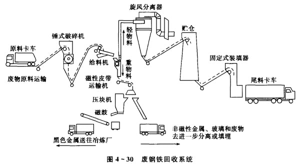 首先考慮分離黑色金屬,因為這類金屬采用磁選法很容易分離。黑色金屬 回收系統(tǒng)通常要用錘式破碎機,廢金屬的尺寸可以大如汽車車體、然后將這種廢 物分成輕、更兩部分。重的部分在磁件傳送帶上進行分離,利用壓塊機將廢物壓 成塊,然后再在金屬轉(zhuǎn)鼓上將黑色金屬與有色金屬分開。在工業(yè)上,也可在廢物 產(chǎn)生地點用目視法和磁選法把黑色金屬利有色金屬分開并裝入各自的料斗.減 少后續(xù)處理的工作量。