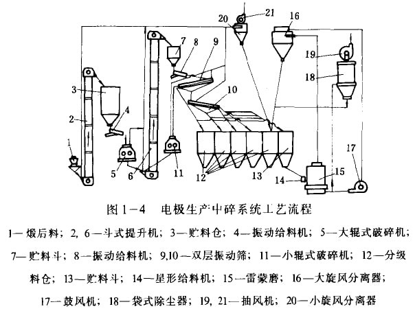 圖1—4為電極生產(chǎn)中碎系統(tǒng)綜合工藝流秤。由圖可見,鍛后料1由提升機2提升到儲料倉3,再由電磁振動給料機4加到輥式破碎機5,破碎后的料由提升機6提升到儲料斗7,再由電磁振動給料機8加到振動篩9,大于4mm的料進入小對輥破碎機11繼續(xù)破碎,然后進人提升機6。從振動篩9篩出的4—2mm的料進入料倉12(進到4—2mm分級科倉)。小于2mm的料進入振動篩10,篩出的2—1mm、1—0.5mm、小于0.5mm的料分別進入料倉12的各分級料倉中。料倉12中的不平衡料進入貯料斗13,再經(jīng)溜槽和星形給料機14加到雷蒙磨15進行磨粉。磨細的粉由鼓風機17鼓進的風帶著經(jīng)過雷蒙磨上的分離器進入旋風分離器16,使粉與空氣分離,分離出來的細粉下列0075mm分級料倉中。經(jīng)分離后的空氣再經(jīng)鼓風機吹入雷蒙磨。為了保持磨機內(nèi)一定的風壓,多余的空氣被送到布袋除塵器18,除塵后的空氣由抽風機19排放,粉塵下到0.075mm的分級料倉。