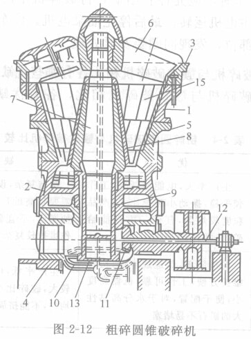 粗碎圓錐破碎機(jī)(旋回破碎機(jī))的剖面圖如圖2—12所示。