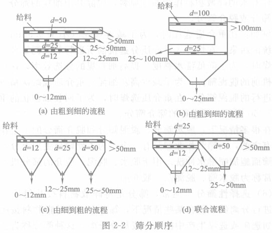 (3)聯(lián)合法:混合篩分。在聯(lián)合流程中,一部分篩面由粗到細排列,另一部分篩面由細到粗排列,如圖2—2(d)中,在生產實踐中,通常使用由粗到細或聯(lián)合的篩分流程。
