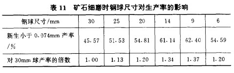 (2)磨碎作用是通過(guò)介質(zhì)實(shí)現(xiàn)的,介質(zhì)尺寸選擇恰當(dāng)與否對(duì) 磨碎過(guò)程影響很大。介質(zhì)尺寸過(guò)大,打擊次數(shù)過(guò)少,過(guò)大的破碎 力又往往發(fā)生貫穿破碎,同時(shí)研磨面積小,研磨能力弱。介質(zhì)尺 寸過(guò)小,破碎能量不足,一次實(shí)現(xiàn)不了破碎時(shí)礦粒接受的變形能 又作彈性恢復(fù)而使能量損失。礦粒經(jīng)多次破碎力作用而達(dá)到疲勞極限時(shí)也能破碎,但破碎概率低。當(dāng)球徑和礦石粒度相適宜時(shí),破 碎力作用精確,破碎作用往往從結(jié)合力弱的晶介面上破裂,既節(jié)省能耗又增加礦物解離的選擇性。表11舉出礦石細(xì)磨(處理物料粒度0. 3mm)下介質(zhì)尺寸對(duì)小于一0. 074mm產(chǎn)率的影響,說(shuō)明過(guò)大過(guò)小的球徑細(xì)磨效率均低,尺寸恰當(dāng)時(shí)效率才最高。
