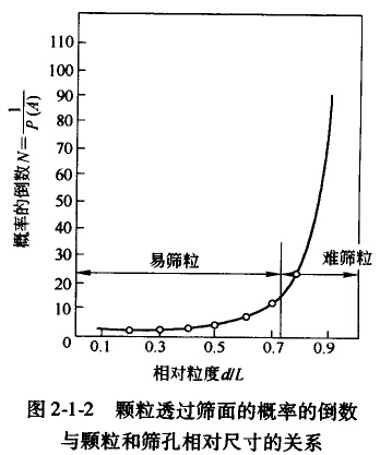 取不同的今比值計(jì)算出的P和N值,見表2—1—1。利用這些數(shù)據(jù)可畫出圖2—14的曲線。曲線可大體劃分為兩段,在顆粒直徑d小于0.75L的范圍內(nèi),曲線較平緩,隨著頹粒直徑的增大,顆粒透過篩面所需的篩孔數(shù)目有所增加。當(dāng)顆粒直徑超過0.75L以后,曲線較陡,顆粒直徑稍有增加,顆粒透過篩面所需的篩孔數(shù)目就需要很多。因此,用概率理論可以證明,在篩分實(shí)踐中,把d<0.75L的顆粒稱為“易篩粒”和d>0.75L的顆粒稱為“難篩粒”是有道理的。