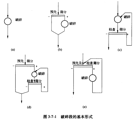 破碎段是由篩分作業(yè)及篩上產(chǎn)物所進人的破碎作業(yè)所組成。個別的破碎段可以不包括篩分作業(yè)或同時包括兩種篩分作業(yè)。