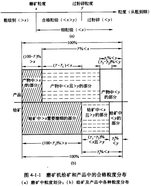 (2)磨礦技術(shù)效率E。磨礦是要將礦料磨到菜一個(gè)指定的粒度x,粒度大于x的稱粗粒級(jí),粒度小于x的稱為細(xì)粒級(jí);而且磨礦中指定某 一個(gè)粒度y為過(guò)粉碎粒度,粒度小于y的稱為過(guò)粉碎級(jí)別,則粒度介于x與y之間的粒度稱為合格粒級(jí)。磨礦中粒度劃分及合格粒度分布的 情況如圖4-1-1。