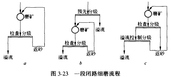圖3-23a所示為常見(jiàn)的設(shè)有檢查分級(jí)的一段閉路細(xì)磨流程;若原料粒度較細(xì),含合格產(chǎn)品在15%以上時(shí),可采用加預(yù)先分級(jí)的一段閉路細(xì)磨流程(圖3-23b);若對(duì)最終細(xì)磨產(chǎn)品要求比較細(xì)時(shí),可采用加路流控制分級(jí)的一段閉路細(xì)磨流程(圖3-23c)。