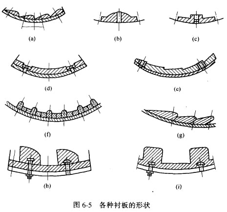 襯板的形狀多種多樣,如圖6-5所示。按其表面形狀可分為平滑和不平滑兩類。不平滑襯板可使磨礦介質(zhì)提升到較髙的高度再落下,并且對鋼球和礦石有較強的攪動,因而適用于粗磨。平滑襯板由于鋼球與襯板之間的相對滑動較大,因而產(chǎn)生較多的研磨作用而適用于細磨。