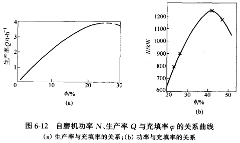 試驗(yàn)表明,隨著磨機(jī)內(nèi)料位的增高,功率消耗也增加,磨機(jī)的產(chǎn)量也相應(yīng)提髙。如圖6-12所示,當(dāng)充填率增加到某一數(shù)值(36%~40%)時(shí),功率消耗達(dá)一極限值,此時(shí)磨機(jī)的產(chǎn)量最髙,當(dāng)充填率再增加時(shí),功率消耗急劇下降,產(chǎn)量也降低,此時(shí)磨機(jī)出現(xiàn)了"脹肚"現(xiàn)象。故對(duì)任一自磨機(jī)均存在一最佳料位值,此時(shí)磨機(jī)消耗功率為最大。物料性質(zhì)不同,最佳料位值也不同。一般為 30%~40%。通過調(diào)整磨機(jī)的給料速度,可使自磨機(jī)經(jīng)常處于最佳料位值工作。