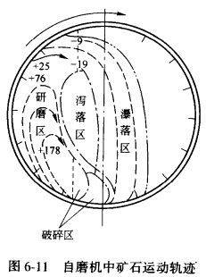 圖6-11表示礦石在自磨機(jī)中的運(yùn)動(dòng)軌跡。在筒 體的徑向方向上,大塊礦石處于旋轉(zhuǎn)的內(nèi)層(靠近磨機(jī)中心),瀉落運(yùn)動(dòng)較多,形成瀉落區(qū)和研磨區(qū),它的循環(huán)周期短,很快地下落至筒體下部,遭到瀑落下來的礦石的沖擊而磨碎。中等粒度礦石在中間層,細(xì)粒較多集中于外層,它們被提升的高度較大,細(xì)粒脫離筒壁后拋落下來形成瀑落區(qū)。瀑落下來的礦石在筒體下部與自磨機(jī)的新給礦相遇,將其擊碎。 礦塊在這一區(qū)域受到的沖擊破碎作用最強(qiáng),故稱為破碎區(qū)。礦石在破碎區(qū)和研磨區(qū)被磨碎到一定粒度后,被氣流或水帶出自磨機(jī)進(jìn)行分級(jí)。