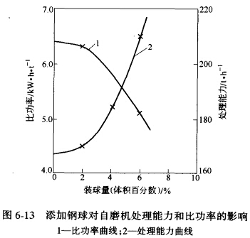 半自磨時(shí),一般加入占磨機(jī)容積2%~8%的鋼球,作為強(qiáng)化自磨的措施之一。鋼球的作用是彌補(bǔ)礦石中粗粒級(jí)的不足和磨碎"頑石",并可從中得到高強(qiáng)度的音響信號(hào),以正確控制給礦量 (見圖6-13),其結(jié)果是提髙生產(chǎn)率、降低比能耗,并改善產(chǎn)品的粒度組成和減少泥化現(xiàn)象,半自磨所加鋼球直徑,通常在40~130mm之間。