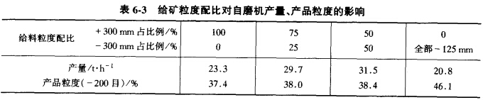為使自磨機(jī)高效率工作,給礦中各粒級(jí)保持適當(dāng)配比是重要的。某燒結(jié)廠對(duì)給料中粒級(jí)配比的試驗(yàn)結(jié)果列于表6-3。由表可知,給料中+300mm粒級(jí)和-300mm粒級(jí)各占50%時(shí),磨礦效果最好,其產(chǎn)量與全部都是粗粒級(jí)或全部是細(xì)粒級(jí)比較,分別提高30.6%和50.5%。