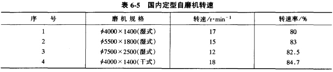 轉(zhuǎn)速率是自磨生產(chǎn)中非常重要的參數(shù)之一,然而,國內(nèi)目前定型的自磨機(jī)轉(zhuǎn)速均已固定,無伸縮余地,如表6-5所示。