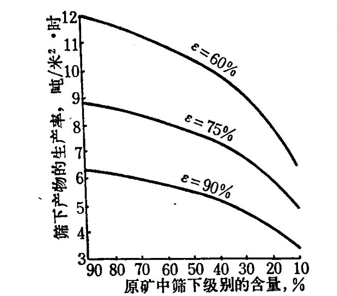 物料的粒度組成對篩分過程有決定性的影響。在任何情況下,細(xì)?偸潜却至H菀淄ㄟ^篩孔。因之,當(dāng)物料內(nèi)細(xì)級別含量增大時,篩子的生產(chǎn)率(無論按給礦量計算還是按篩下產(chǎn)物計算)也隨之顯著增大。下圖的曲線表示不同篩分效率時生產(chǎn)率(按篩下產(chǎn)物量計算)與原物料內(nèi)細(xì)粒級別含量之間的關(guān)系。由圖可以看出,當(dāng)原物料內(nèi)篩下級別的含量由10%增加到90%時,篩子的生產(chǎn)率幾乎增大一倍。這是因?yàn)楫?dāng)篩下級別含量大的物料給到篩上時,細(xì)粒就很容易且迅速通過篩孔,而留在篩上的物料就很少了,這時即使在篩上物料內(nèi)還有一些"難篩顆粒",相對地比較容易通過篩孔,因?yàn)槠渌牡V粒對它們的影響也小。反之,當(dāng)原物料內(nèi)篩下級別含量少時,因?yàn)檎麄篩面幾乎被篩上產(chǎn)物所占據(jù),妨礙了細(xì)粒子通過篩孔,因此在保證篩分效率相等的條件下,按給礦量計算的生產(chǎn)率也就降低了。所以當(dāng)原物料中細(xì)級別少,而粗級別的粒度又比篩孔尺寸大得很多的時候,有的生產(chǎn)廠為了提高篩子的生產(chǎn)能力和延長篩網(wǎng)的使用壽命采用雙層篩作單層篩使用。上層篩孔較大的輔助篩網(wǎng)預(yù)先排出過粗的級別,然后下層篩對含有大量細(xì)級別的較細(xì)物料進(jìn)行最終篩分。