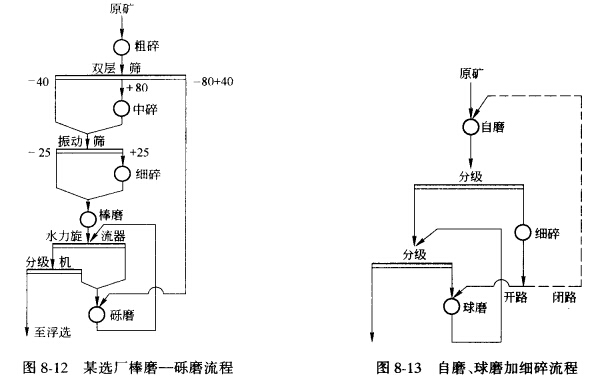 對(duì)于不適合于用自磨機(jī)組磨的硬度較大的礦石,可采用先將礦石破碎后再用棒磨機(jī)作為第 一段粗磨,從破碎產(chǎn)物中篩出部分礫石作為礫磨機(jī)介質(zhì)進(jìn)行第二段細(xì)磨的兩段半自磨流程,我國(guó)某銅礦選礦廠就是采用這種棒磨加礫磨流程的,如圖8—12所示,該廠處理的是含銅矽卡巖類(lèi)型礦石,普氏硬度系數(shù)f=12—16,要求磨礦紉度為—200目占65%。實(shí)踐表明,這種流程對(duì)礦石的適應(yīng)性較廣泛,礫石的大小和數(shù)量易控制,生產(chǎn)條件比較穩(wěn)定,操作容易掌握。礫磨中的難磨粒級(jí)是通過(guò)間斷排出并送回棒磨機(jī)再磨的辦法來(lái)處理的。