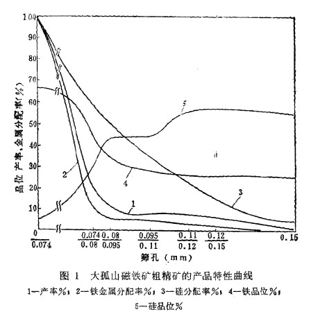 我國鐵礦資源豐富,但富礦少貧礦多。在貧鐵礦小,有用礦物以磁鐵礦為主,脈石礦物以石英為主的鞍山式磁鐵礦的量很大且分布較廣,這類礦石的儲量及)開采量約占全國鐵礦的二外之一。由于磁鐵礦性脆易磨碎,而石英較硬及韌性較大, 不易磨碎,結(jié)果在磨礦過仍小產(chǎn)今明顯的選擇性磨碎現(xiàn)象,使磨礦產(chǎn)品中磁鐵礦的粒發(fā)細(xì),石英粒度粗;磨礦產(chǎn)品的這種粒度分布特征也反映在粗精礦中。圖1是鞍鋼大弧山選廠磁鐵礦粗精礦的產(chǎn)品粒度、品位及欽金屬分布的特性曲線。由圖可以看出,細(xì)級別合鐵高,合硅低,產(chǎn)率大;粗級別則含鐵低,含硅高,產(chǎn)率小。可見,由于選擇性磨碎作用的結(jié)果,使粗精礦在粗細(xì)兩個級別出現(xiàn)了鐵及硅的質(zhì)量分離現(xiàn)象。如果選擇一個恰當(dāng)?shù)谋患壏蛛x點(diǎn),使可以得到質(zhì)量萬同的兩個產(chǎn)品,起到分選作用。從圖l中看出,若分離點(diǎn)選為0.074MM(200目),用細(xì)篩將此粗精礦分成篩上及篩下產(chǎn)品,則可得到產(chǎn)率80.5%、合鐵67%、合硅30%左右及回收率88.6%的高質(zhì)量鐵精礦(篩下產(chǎn)品)。長沙黑色金屬礦山設(shè)計院作過分析,采用細(xì)篩篩選再磨粗精礦,可以使鐵精礦品位提高2—3%,而每提高1%鐵品位,SiO2含量下降1.1—1.3%,焦比降低2%,高爐利用系數(shù)增加3%,渣量減少50kg左右。在不增加選礦投資、不增加選礦加工費(fèi)用及不改變其他選礦指標(biāo)的條件下,可使每噸生鐵成本降低1.3—1.9元,生鐵綜合投資下降3—3.7,總費(fèi)用減少12—15元。如果所有鞍山式磁鐵礦選廠均采用這一措施,全國標(biāo)年生產(chǎn)生鐵的總費(fèi)用將下降2.5—3億元。由于這一措施簡易可行,且具有明顯的經(jīng)濟(jì)效益,所以目前我國東北及華北地區(qū)已有二十多個黑色金屬礦山安裝了2000多臺細(xì)篩投入生產(chǎn)。武鋼礦山研究所與金山店鐵礦合作,利用磁鐵礦易磨粒度細(xì)的特點(diǎn),進(jìn)行了細(xì)篩工藝的小型試驗及工業(yè)試驗,并獲得了好的經(jīng)濟(jì)效果:鐵精礦品位平均提高2%左右,二氧化硅含量降低5%,合硫降至0.3一0.4%以下,而鐵的回收本未受影響。一個系列(按原礦臺時產(chǎn)量116.3t計)每年可盈利22萬元左右。應(yīng)指出的是,上述廠礦僅利用了選擇性磨碎現(xiàn)象,并沒有注意調(diào)節(jié)這種現(xiàn)象,如果對這種現(xiàn)象加以調(diào)節(jié),效果將更顯著。