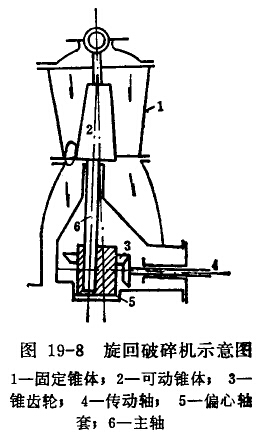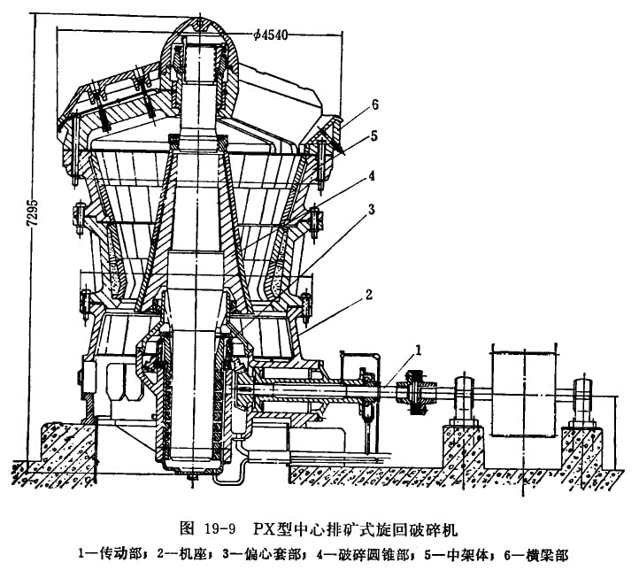 圖19-9是我國冶金礦山應(yīng)用比較廣泛酌PX型中心排礦式旋回破碎機的結(jié)構(gòu)示意圖。這種破碎機由傳動部l、機座2、偏心套部3、破碎圓錐部4、中架體5和橫梁部6以及潤滑系統(tǒng)、電氣裝置等組成。
