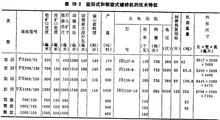 旋回破碎機的規(guī)格用給礦口寬度和排礦口寬度表示:PX900/150指旋回破碎機的給礦口寬度B為900毫米,排礦口寬度e為150毫米,拼音字母P代表破碎機,X代表旋回式。我國從1953年開始制造第一臺側(cè)面排礦的旋回破碎機,目前已能少產(chǎn)系列的液壓旋回破碎機,最大設(shè)計規(guī)格為1850/270。國外最大規(guī)格的旋回破碎機,其給礦口為2130毫米。表19-2列出了國產(chǎn)主要旋回破碎機和顎旋破碎機的主要技術(shù)特征。