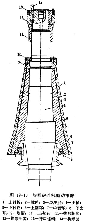 破碎圓錐,即可動圓錐,是直接破碎礦石的部件,敷有錳鋼襯板;襯板和錐體之間撓注一層鋅合金,以保持二者緊密接觸;襯板板上端則用螺帽和止動環(huán)壓緊。