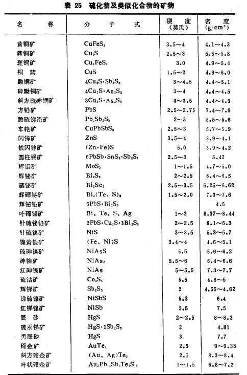 (2)硫化物及其類似化合物類礦物。此類礦物多為極性 共價(jià)鍵或混合鍵聯(lián)結(jié),這是工業(yè)上有很大實(shí)際意義的一大類礦物,共有350多種,常見的主要是Cu、Pb、Zn、Hg、 Ni、Co、 Mo、Cd、Bi等金屬與S、Se、Te、As形成化合物。此類礦物的硬度一般不高,大都欠2?4之間,少數(shù)為5?6,仍密度較大,多數(shù)在4以上。常見的硫化物及類似化合物如表25所列。此類礦物由于硬度低、密度大、在磨碎時(shí)常常優(yōu)先被粉碎。這正是選礦廠所得精礦的平均粒度一般均比尾礦細(xì)的基本原因。