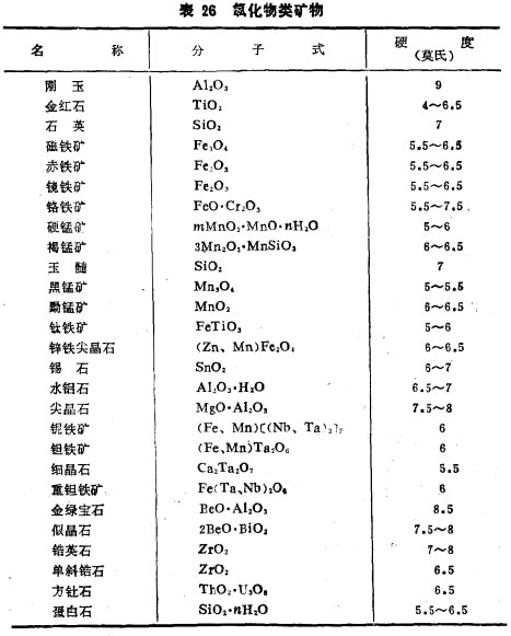 (3)氧化物類礦物。這也是自然界存在較多的一類礦物, 主要為離子鍵(二價(jià)金屬氧化物),但隨著金屬離子價(jià)態(tài)的升髙也有向共價(jià)鍵過(guò)渡的特點(diǎn)(三價(jià)或四價(jià)金屬氧化物)。表26列出一些常見的氧化物類礦物。此類礦物的硬度一般較大,莫氏硬度在5,5以上,物理化學(xué)性質(zhì)穩(wěn)定。
