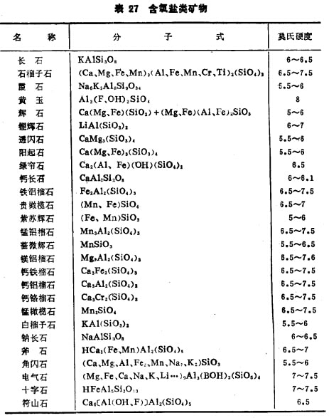 (5)含氧鹽類礦物。這是一類數(shù)量眾多的礦物,約占已知礦物數(shù)量的三分之二,其中包括硅酸鹽、碳酸鹽、琉酸鹽、磷酸鹽、鎢酸鹽等若干個(gè)亞類。此類礦物的陰離子對(duì)外部陽(yáng)離子是離子鍵結(jié)合,但陰離子內(nèi)部(即"根")卻是共價(jià)鍵結(jié)合。值得注意的是硅酸鹽礦物,一是數(shù)量大,約占已知礦物的三分之一,按重量計(jì)則占地殼重量的75%; 二是它們?yōu)橹饕鞄r曠物,是選礦的主要脈石成分,也是磨碎的主要對(duì)象;三是基本構(gòu)造單位為硅氧四面體【SiO4】, Si+4與四個(gè)頂角氧形成共價(jià)結(jié)合,故硬度很大,難磨碎。表27中列出常見的主要硅酸鹽類曠物。