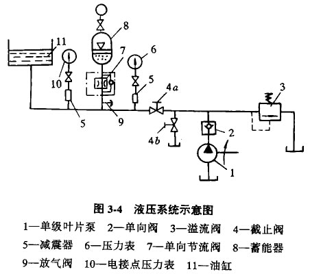液壓系統(tǒng)由單級葉片泵I、單向閥2、溢流閥3、截止閥4、單向節(jié)流閥7和蓄能器8等組成。如圖3-4所示。蓄能器起保險作用,內(nèi)部充氣壓力一般為1.1MPa。單向節(jié)流閥起過鐵時動作快,復位時動作慢的作用,以減輕復憤時對破碎機的強烈沖擊。