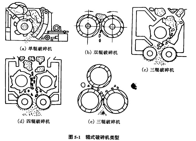 近年來,國(guó)外輥式破碎機(jī)發(fā)展得很快,種類也很多,規(guī)格比較齊全。按輥?zhàn)拥臄?shù)目,輥式破碎機(jī)可以分為單輥、雙輥、二輥和四輥四種;按輥面形狀,可分為光輥、齒輥和槽形輥破碎機(jī),輥式破碎機(jī)的類型如圖5-1所示。