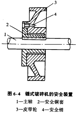 錘式破碎機的安全裝置如圖6-4所示。在破碎機的主軸上裝有安全銅套2,皮帶輪3套在銅套上,銅套與皮帶輪則用安全銷4連接,當(dāng)破碎機內(nèi)進入金屬物或過負(fù)荷時,安全銷即被剪斷而起保護作用。安全銷的材質(zhì)應(yīng)按規(guī)定或經(jīng)過實踐驗證,不能用強度過大的材料作安全銷,以防止進入金屬物后安全銷不斷裂,損壞其他零件和造成大的事故。