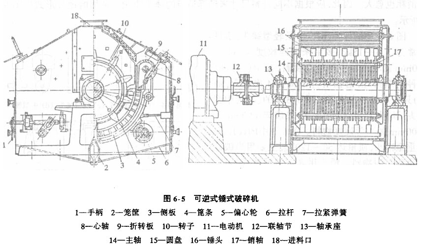 圖6-2是單轉(zhuǎn)子不可逆式錘式破碎機。它由機殼1、轉(zhuǎn)子2、篦條3、打擊板4和軸承5等部分組成。