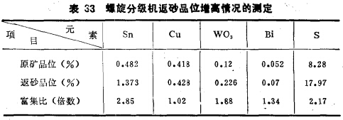表33中列出某多金屬硫化礦在第一段磨礦分級(jí)機(jī)返砂中各種金屬礦物富集的情況。表33說(shuō)明,磨碎錫石多金屬硫化礦時(shí),各種金屬在分級(jí)機(jī)返砂中均有富集,尤以密度大的錫石、黑鎢礦更為突出,磁黃鐵礦也因粒度粗使富集比大。此外,對(duì)返砂中錫石的解離情況分析表明,其中游離的錫金屬率約占70%左右。性脆易碎的錫石,雖已基本單體解離,但還返入磨機(jī)藎復(fù)再磨,致使造成嚴(yán)重的錫石過(guò)磨及過(guò)粉碎。例如,某錫石硫化礦選廠的生產(chǎn)統(tǒng)計(jì)證明,第一段磨機(jī)由于磨礦分級(jí)循環(huán)中錫石高度富集所造成 錫金屬的過(guò)粉碎現(xiàn)象十分嚴(yán)重,過(guò)粉碎率約高達(dá)6~8%,即等于有6~8%的錫金屬因磨礦分級(jí)狀況不佳被損失了。