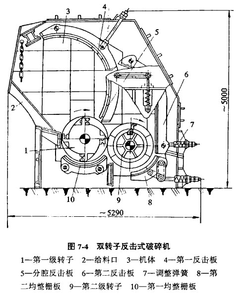 我國生產(chǎn)的φ1250x1250雙轉(zhuǎn)于反擊式破碎機(jī)的構(gòu)造如圖7-4所示。該機(jī)具有破碎比大、生產(chǎn)率高、電耗少等待點(diǎn)。
