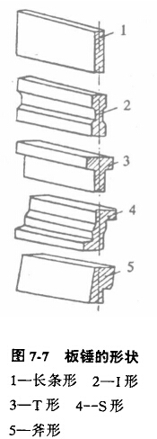 反擊式破碎機(jī)使用的板錘形狀有很多,如圖7-7所示,有長(zhǎng)條形、I形、T形、s形和斧形。