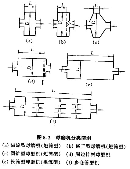 ②長筒磨機:簡體長度L=(1.5-3)D,如圖8-2(e)所示。