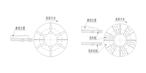 老型PFL的甩料盤結(jié)構(gòu)如圖1所示:由于甩料盤的筋靠近圓周邊緣的切線速度比內(nèi)側(cè)要高、磨損要快,材料利用率很低(不足10%),甩料盤筋的形狀和磨損位置如圖1所示。