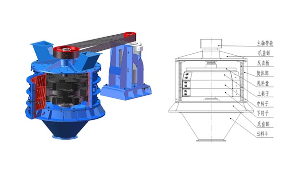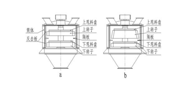環(huán)形隔板或篦板的作用是:物料通過第一破碎腔破碎后,在環(huán)形隔板或篦板上自然形成堆積角,將物料導(dǎo)向下甩料盤,使其二次加速重復(fù)上一級的破碎過程。由于筒體高度的局限性,使上、下轉(zhuǎn)子間距較小,環(huán)形隔板或篦板距上轉(zhuǎn)子錘頭太近,不但形不成自然堆積角,反而經(jīng)常引起堵料和上錘頭的過度磨損。