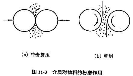 在立式攪拌磨機(jī)中,粉磨介質(zhì)的這種非群體的不規(guī)則運(yùn)動(dòng),其結(jié)果造成介質(zhì)之間撞擊及介質(zhì)以不同轉(zhuǎn)速和方向旋轉(zhuǎn)著,從而對(duì)鄰近的物料施加沖擊力、擠壓力和剪切力,如圖11-3所示。物料在這些力的聯(lián)合作用下被細(xì)磨或超細(xì)粉磨。