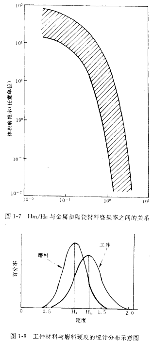 由此可見,當(dāng)磨料硬度遠(yuǎn)遠(yuǎn)大于材料硬度時,磨損嚴(yán)重,磨損與材料硬度無關(guān);當(dāng)材料硬度接近于磨料硬度時,隨比值的增大,磨 損急劇減小。應(yīng)該指出的是,即使是很軟的磨料,由于沖擊作用或者其中滲有硬磨料等因素,也會導(dǎo)致工件的磨損。因為實際磨料的硬 度和材料硬度都不是一個單一的數(shù)值而是一個分布值(見圖1-8)。因而,即使工件的平均硬度值超過磨料的平均硬度值,由于磨料與 材料硬度的統(tǒng)計分布關(guān)系也會引起磨損。這就說明了為什么煤炭的硬度不高,但對煤炭機(jī)械造成的磨損仍然是十分嚴(yán)重的事實。表1-2 表示了各種磨料類型及巖石硬度值。