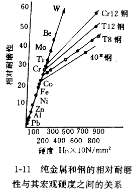 工業(yè)純金屬的耐磨性與其彈性模量成正比(見圖1-10)。但這種關(guān)系不適用于熱處理過的鋼材,雖然熱處理不改變材料的彈性模量, 但都會使其耐磨性大大提高。相反,工業(yè)純金屬和不同類型鋼相對耐磨性與其宏觀硬度成正比(見圖1-11)。熱處理前后鋼的相對耐磨性 單值地決定于其宏觀硬度,只不過隨其宏觀硬度增高其耐磨性變化斜率不同而已。耐磨性不僅取決于鋼的硬度、而且取決于它們的成分 ,不同成分的鋼熱處理后雖然具有相同的硬度,但其耐磨性卻不同,這說明各種鋼的耐磨性與其宏觀硬度間并不存在單值的對應(yīng)關(guān)系。