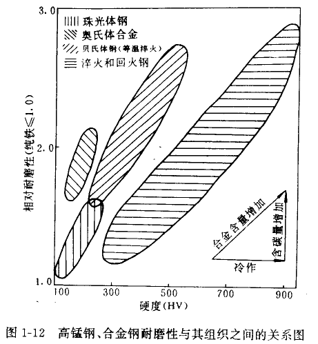 圖1-12是高錳鋼、合金鋼的耐磨性與它們組織之間的關(guān)系網(wǎng)。在一定的接觸應(yīng)力、一定的滑動磨料磨損試驗條件下,具有較高含碳 量的回火馬氏體鋼能獲得較高的耐磨性;相同硬度條件下,貝氏體的耐磨性又比回火馬氏體的耐磨性高。這時的高錳鋼只相當(dāng)于回火馬 氏體和貝氏體鋼的中等耐潛水平;珠光體的硬度最低,耐磨性最差,相同距度的田氏體與珠光體組織相比,奧氏體的耐磨性又高得多。 殘余奧氏體對鋼的耐磨世也是有影響的。很多學(xué)者認(rèn)為,在馬氏體一碳化物的混合組織中存在者殘余奧氏體.對提高抗廟料磨損性能是 有益的。殘余奧氏體在其中起的作用一般認(rèn)為是: