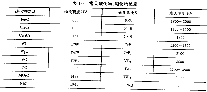 在碳化物中,M3C型結(jié)構(gòu)的硬度較低,對耐磨性貢獻(xiàn)小,馬氏體和合金工具鋼中碳化物多屬于M3C型結(jié)構(gòu)。高鉻鑄鐵中碳化物主要是 (FeCr)C3型碳化物,也有少量的(FeCr)6C、(FeCr)23C6型碳化物,他們的硬度均較M3C型為高,對耐磨性貢獻(xiàn)也大。在硬質(zhì)合金 中的碳化物大多是WC、TiC、ZrC、Nh、VC等。它們都具有極高的硬度和高溫穩(wěn)定性,是硬質(zhì)合金具有高的耐湃性利紅硬件的土要原因。 此外,很多合金元素還可與B生成Fe2B、TiB,CrB等同硬度的刪化物,對材料的耐磨性也具有較大的影響。常見的碳化物、硼化物硬度 見表1-3。