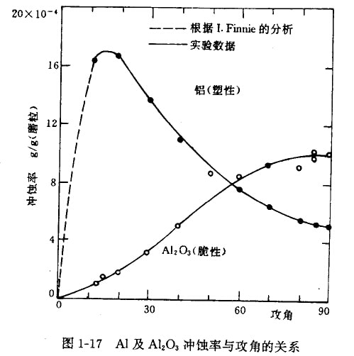 塑性材料在20一30°沖擊射角時沖蝕率出現(xiàn)最大值,而脆性材料在一般情況下最大沖蝕率出現(xiàn)在接近90°角處。圖1-17是金屬鋁及氧化鋁受SiC粒子沖蝕時沖蝕串隨沖擊角變化情況。