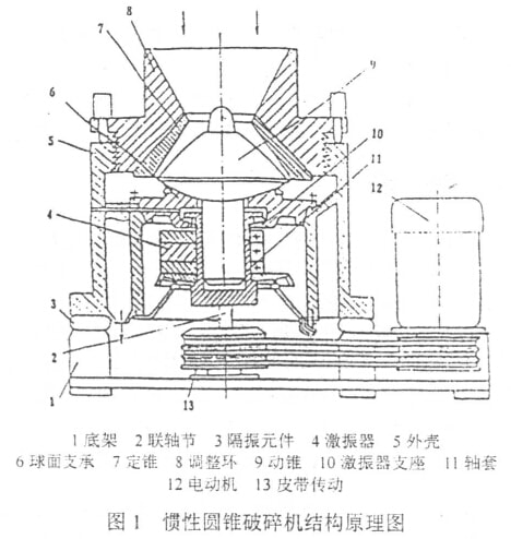 慣性圓錐破碎機(jī)的結(jié)構(gòu)如圖1所示。它的機(jī)體座落在隔振裝置上,工作機(jī)構(gòu)由定諧錐和動(dòng)錐組成,錐體上均附有耐磨襯板,襯板之間的空間形成破碎胺。動(dòng)錐軸插入軸套中,電動(dòng)機(jī)的旋轉(zhuǎn)運(yùn)動(dòng)通過傳動(dòng)機(jī)構(gòu)傳給固定在軸套上的激振器,激振器旋轉(zhuǎn)時(shí)產(chǎn)生慣性力,使動(dòng)錐繞球面支承的球心做旋擺運(yùn)動(dòng),動(dòng)錐與傳動(dòng)機(jī)構(gòu)之間無剛性聯(lián)接。當(dāng)破碎腔內(nèi)無物料時(shí),動(dòng)錐將沿定錐內(nèi)表面滾動(dòng)。當(dāng)破碎腔內(nèi)有物料時(shí),動(dòng)錐將沿料層滾動(dòng),在滾動(dòng)的同時(shí)隨物抖層厚度的變比伴隨有強(qiáng)烈脈動(dòng)沖擊,從而對(duì)物抖進(jìn)行破碎。