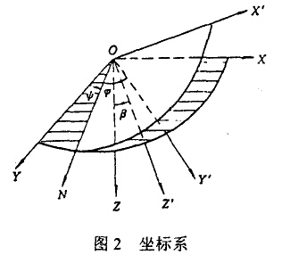 動(dòng)錐與電機(jī)之間無剛性聯(lián)接,繞球面支承的球心O做旋擺運(yùn)動(dòng),動(dòng)錐相對(duì)于機(jī)體的運(yùn)動(dòng)力剛體繞定點(diǎn)O的轉(zhuǎn)動(dòng)。以O(shè)點(diǎn)為原點(diǎn),機(jī)體中心線為Z軸建立坐標(biāo)系OXYZ,另取以動(dòng)錐軸線為Z′軸并與動(dòng)錐固結(jié)的動(dòng)坐標(biāo)系OX′Y′Z′,如圖2所示。動(dòng)坐標(biāo)平面OX′Y′與定坐標(biāo)平面OXY的交線用ON表示,稱為節(jié)線,節(jié)線垂直于OZ和OZ′,節(jié)線與定軸OY間的夾角ψ稱為進(jìn)動(dòng)角,節(jié)線與動(dòng)錐OY′間的夾角φ稱為自轉(zhuǎn)角,動(dòng)錐OZ′與定軸OZ間的夾角β稱為章動(dòng)角,根據(jù)運(yùn)動(dòng)學(xué)原理,繞O運(yùn)動(dòng)的動(dòng)錐相對(duì)于機(jī)體的位置用這三個(gè)角可以完全確定,因此,動(dòng)錐相對(duì)于機(jī)體的運(yùn)動(dòng)是由以下三種旋轉(zhuǎn)運(yùn)動(dòng)組成。