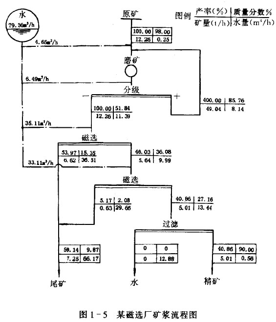如果在線流程因上把各產(chǎn)物(包括原礦和中間產(chǎn)物)的礦量、質(zhì)量分?jǐn)?shù)、水量和各作業(yè)的補(bǔ)加水量均標(biāo)出來(lái),則稱為礦漿流程圖,如圖1-5所示。通過(guò)此圖可了解各作業(yè)及產(chǎn)物的質(zhì)量分?jǐn)?shù)和耗水量,也是指導(dǎo)生產(chǎn)的依據(jù)之一。