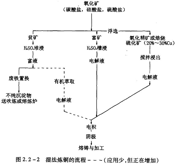 濕法煉銅占銅生產(chǎn)量的10%,主要用于處理氧化礦,也有的處理硫化礦。其流程如圖2.2-2所示。它包括兩個主要過程,銅的浸出和從溶液中電積或置換提取銅。