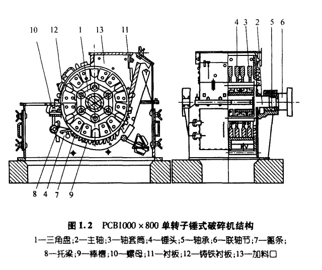 沖擊式細(xì)碎機(jī)是—種錘式破碎機(jī),具有產(chǎn)品粒度細(xì)、破碎比大、產(chǎn)量高等特點(diǎn),適于將各種粒度小于60mm的中硬物料細(xì)碎到5mm 以下(占產(chǎn)量的80%左右)。合肥水泥研究設(shè)計(jì)院設(shè)計(jì)的CXL-ø800mm×300mm沖擊式細(xì)碎機(jī)的結(jié)構(gòu)如圖1.8所示。
