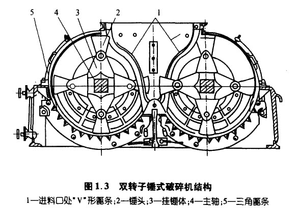 錘式破碎機(jī)按回轉(zhuǎn)軸的軸數(shù)分類,有單轉(zhuǎn)子和雙轉(zhuǎn)子兩種型式;按轉(zhuǎn)子回轉(zhuǎn)方向分類,有可逆式和不可逆式之區(qū)別。錘式破碎機(jī)的捶 頭結(jié)構(gòu)和村質(zhì)是決定產(chǎn)品質(zhì)量和破碎效率的重要部件.為了延長(zhǎng)錘頭的使用壽命,一般在錘頭的兩端均開設(shè)安裝孔,以便調(diào)頭安裝或正 反面調(diào)換使用。圖1.2和圖1.3分別為單轉(zhuǎn)子和雙轉(zhuǎn)子錘式破碎機(jī)的結(jié)構(gòu)原理圖。雙轉(zhuǎn)子捶式破碎機(jī)設(shè)有‘v”形篦條,在一 對(duì)轉(zhuǎn)子的上錘頭之間構(gòu)成了一個(gè)預(yù)破碎腔,大塊物料在進(jìn)入兩回轉(zhuǎn)軸形成的兩個(gè)細(xì)碎腔之前,先進(jìn)行預(yù)破碎,因此,這種破碎機(jī)具有破 碎比大、喂料均勻、兼有預(yù)碎和細(xì)碎兩段破碎功能等特點(diǎn),常被用作石灰石一段破碎系統(tǒng)。