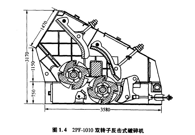 2PF-1010雙轉(zhuǎn)子反擊式破碎機(jī)可用來(lái)破碎游離石英量<7%,水分<10%的石灰石、石膏和泥灰?guī)r等抗壓強(qiáng)度<140MPa的物料,如圖 1.4所示。